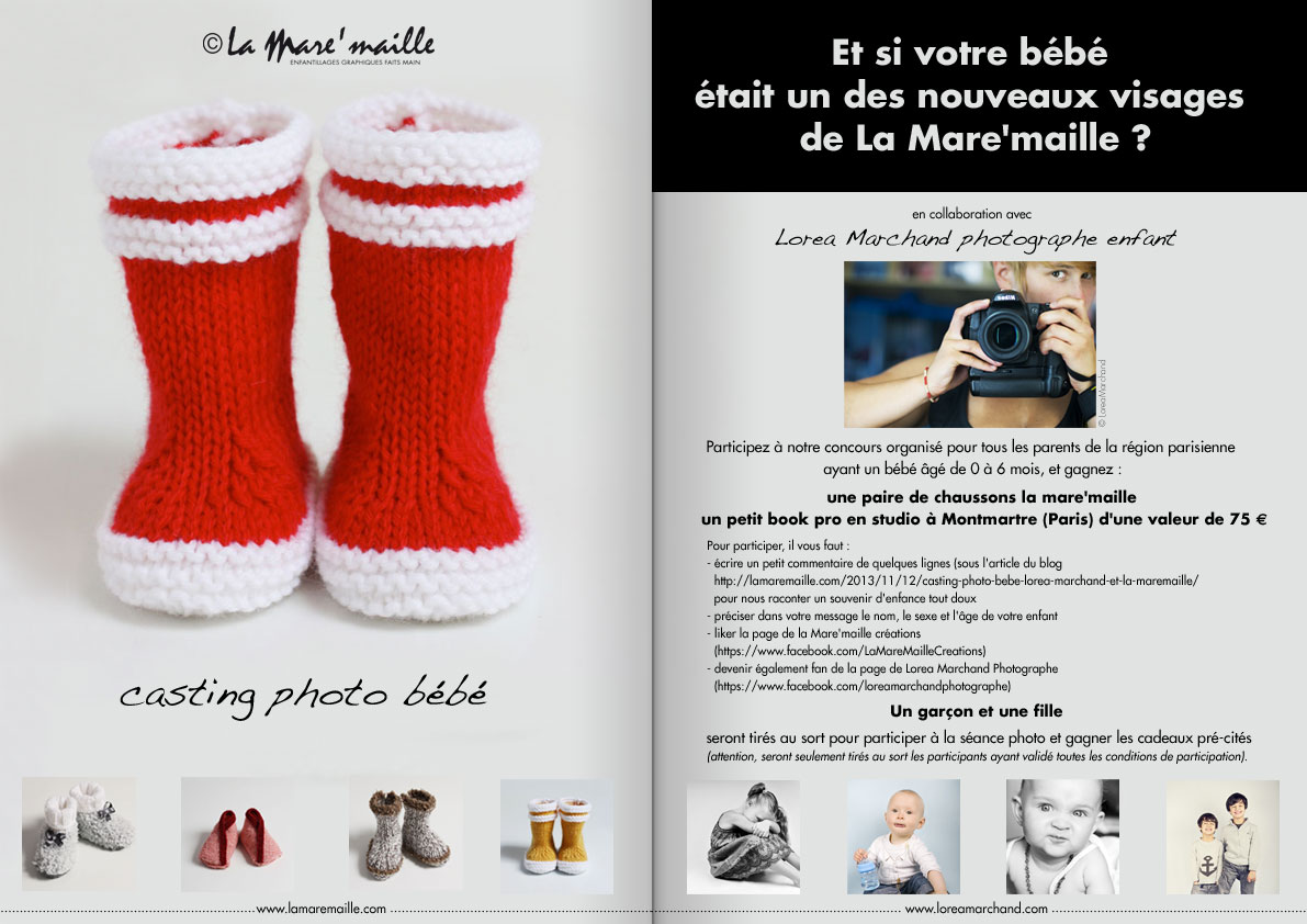 Vous désirez que votre bébé devienne l’un des nouveaux visages d’une petite marque éthique et tendance, et participe à la promotion des chaussons bébé maille tricotés à la main par La Mare’maille ? Alors participez à ce casting et tentez votre chance, pour cela il vous faut :