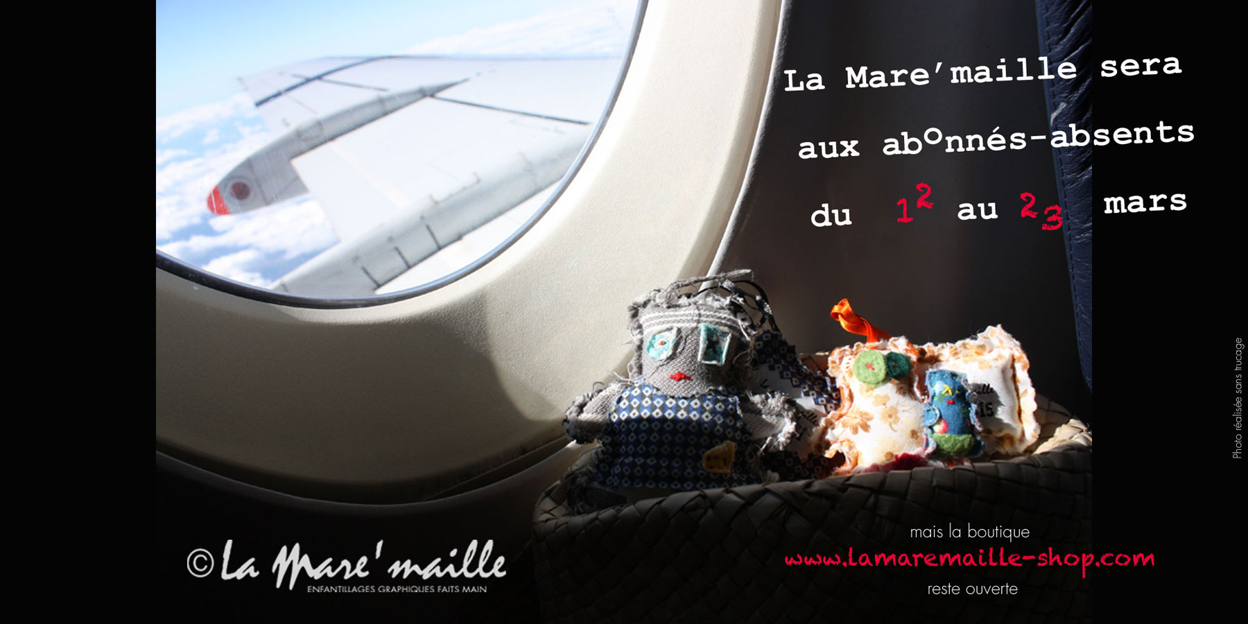 La Mare’maille ne s’est pas arrêtée un seul jour, (même pas un dimanche) depuis Août dernier. Aussi, après un hiver hyperactif, elle a (vraiment) besoin de se changer (un petit peu) les idées. Elle fait donc une (petite) pause du 12 au 23 mars. La boutique http://www.lamaremaille-shop.com reste ouverte, passez votre commande dès à présent, elle sera validée aujourd’hui et gérée dès le 24 mars prochain. Merci de votre compréhension.