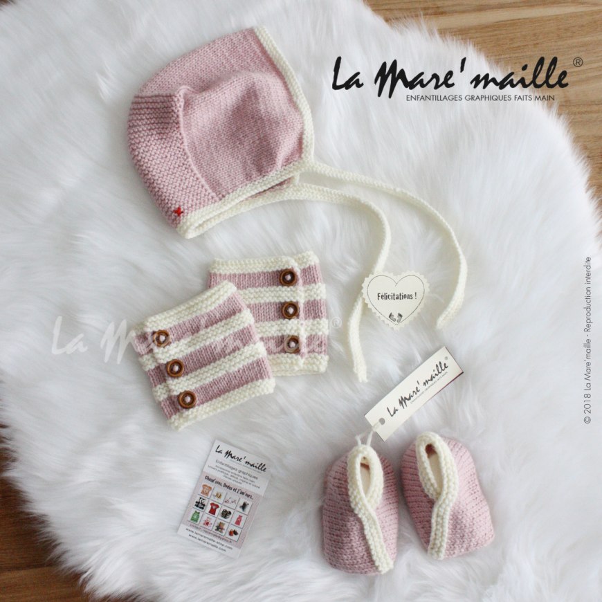 Avis de grand froid, ensemble bébé chaussons guêtres et bonnet béguin en laine La Mare’maille
